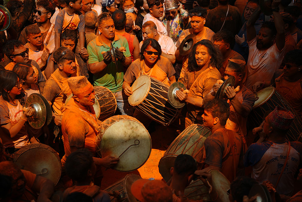 In Thimi, Sindoor Jatra unfolds in a blaze of vermillion. Thirty-two chariots surge and collide amid clouds of orange powder, turning the streets into a canvas of devotion and identity—a celebration both chaotic and deeply rooted.